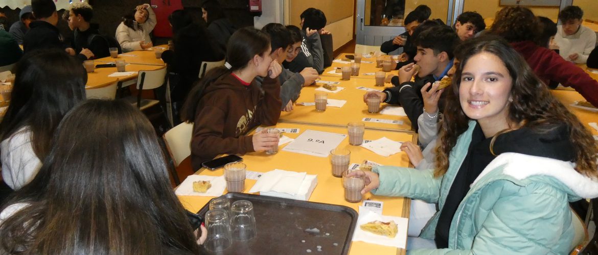 Às 10 horas e 20 minutos, os alunos de Francês do 3º ciclo (7º, 8º e 9º anos) deslocaram-se ao refeitório, acompanhadas dos respetivos professores, para saborearem a “galette des rois”, bolo típico francês servido nesta época natalícia, e beberem um copo de cacau quente. Este bolo é composto por duas camadas de massa folhada entre as quais há uma camada de massa de amêndoa. Enquanto os alunos comiam e bebiam, houve muita animação e boa disposição nas várias mesas. Reconfortados com este bolo especial, após momentos de partilha e alegria, os alunos retomaram as atividades letivas. Este tipo de atividade permite reconhecer elementos constitutivos da sua própria cultura e da cultura da língua estrangeira, permitindo a comparação e aceitação de outras realidades culturais.